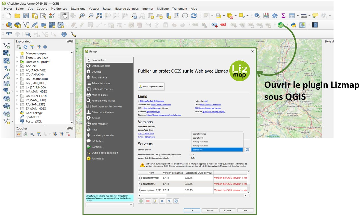 Après téléchargement ou mise à jour si nécessaire, ouvrir le plugin Lizmap sous QGIS, dans la palette des menus de la fenêtre, se placer sur l'onglet "i" information.