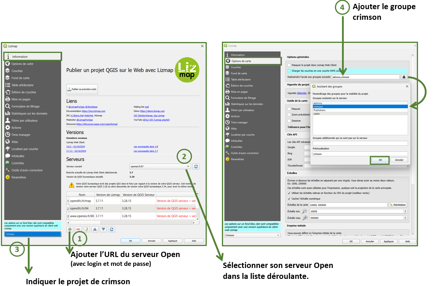 •Cliquer sur le bouton "+" de la palette, dans la fenêtre qui s’ouvre ajouter l’URL du serveur Open avec login et mot de passe puis valider. (1)